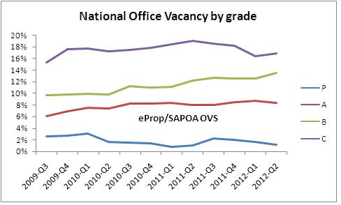 Prime space continues to perform substantially better than lower grade stock with "P" grade offices trending below 2% and "A" Grade below 9%. Negative take up appears to have impacted "B" grade offices the most judging from the trend; and from the fairly volatile trend, C grade space appears to be the subject of refurbishing strategies undertaken by landlords in pursuit of the Prime grade market.